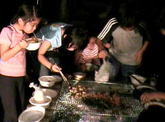 遊んで働いて、お腹ペコペコになったから、ご飯とバーベキュウは目が飛び出るほどおいしかった。おもわず、「うめ〜っ!」 |
