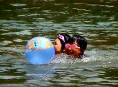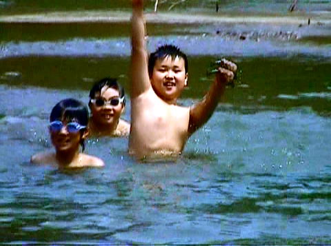 自分の荷物を背負って、灼熱の山道を4kmを歩いた後、飛び込んだ鏡川の支流は、冷たくてとても気持ちが良かった。子供達の元気な歓声が山にこだましていた。 |