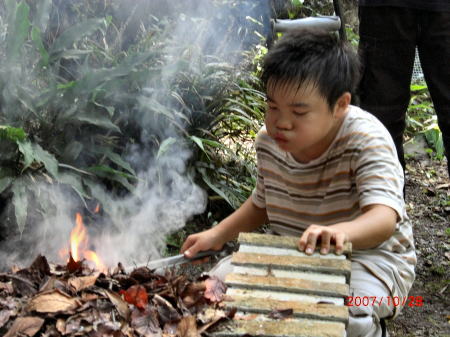 6.火おこしは、ぼくにまかせて。フーフー。フ〜〜フ〜〜ッ。 |